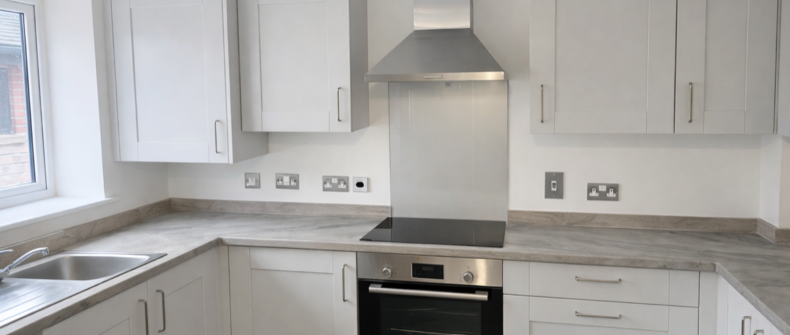 - Open plan kitchen with integrated electric hob, oven and hood (gas supply available)